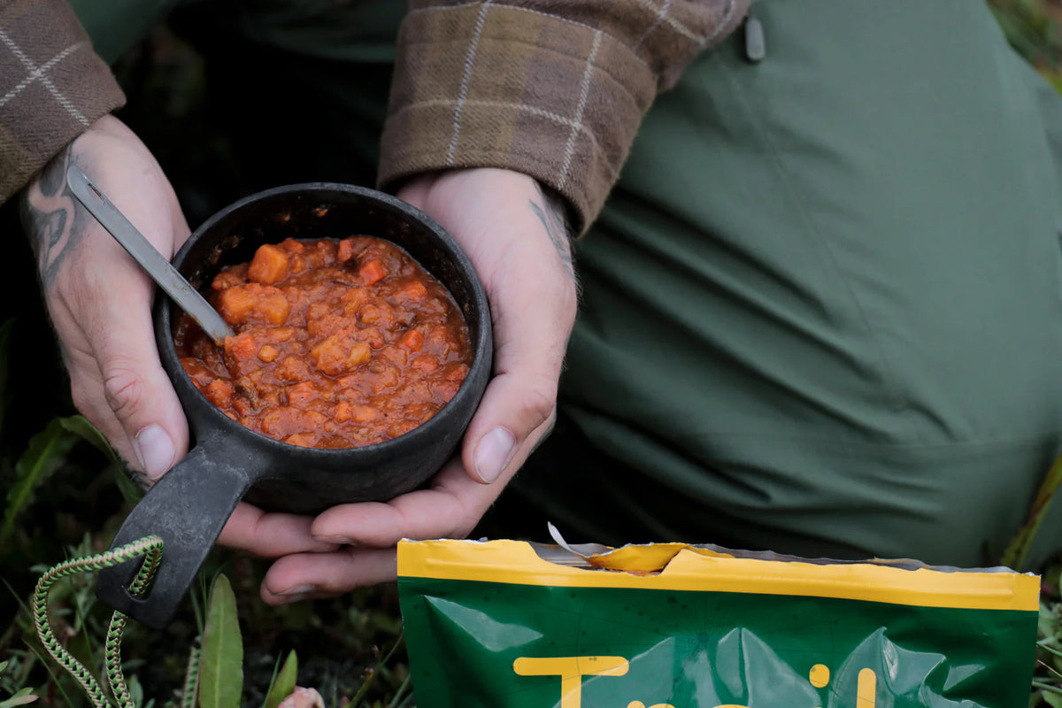 Ingredienser: For at lave 100 g tørt produkt bruges 126 g kartoffel*, tomat*, 58 g oksekød*, løg*, gulerod*, knoldselleri*, rapsolie*, tomatkoncentrat*, hvidløg*, paprika*, salt, spidskommen*, timian*, peber*, chili*, naturlig aroma, maltodextrin*, majsstivelse*, krydderier*, oksefedt*.