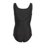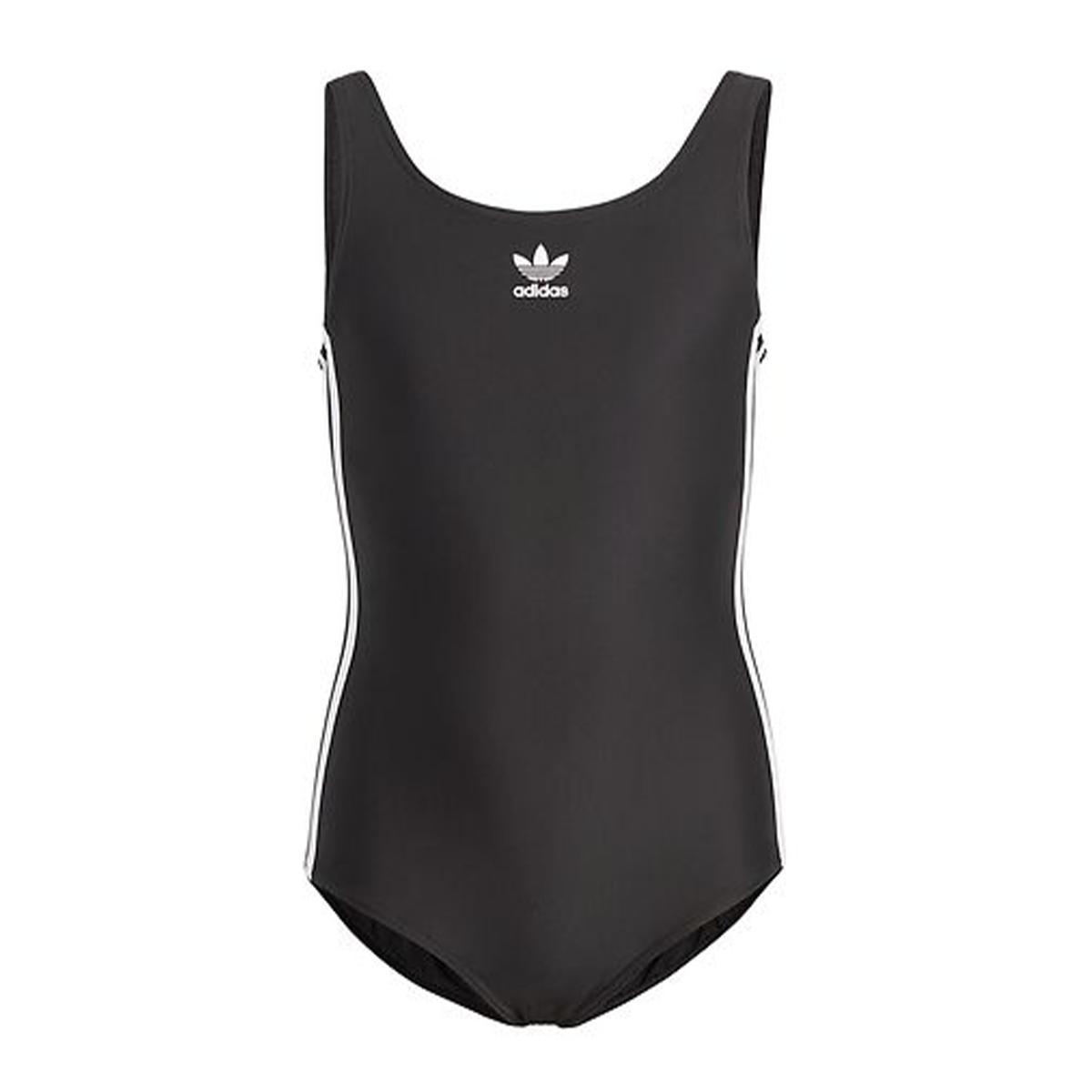 Smart adidas Originals badedragt i sort med hvidt logoprint under halsudskæringen og tre markante hvide striber langs begge sider.