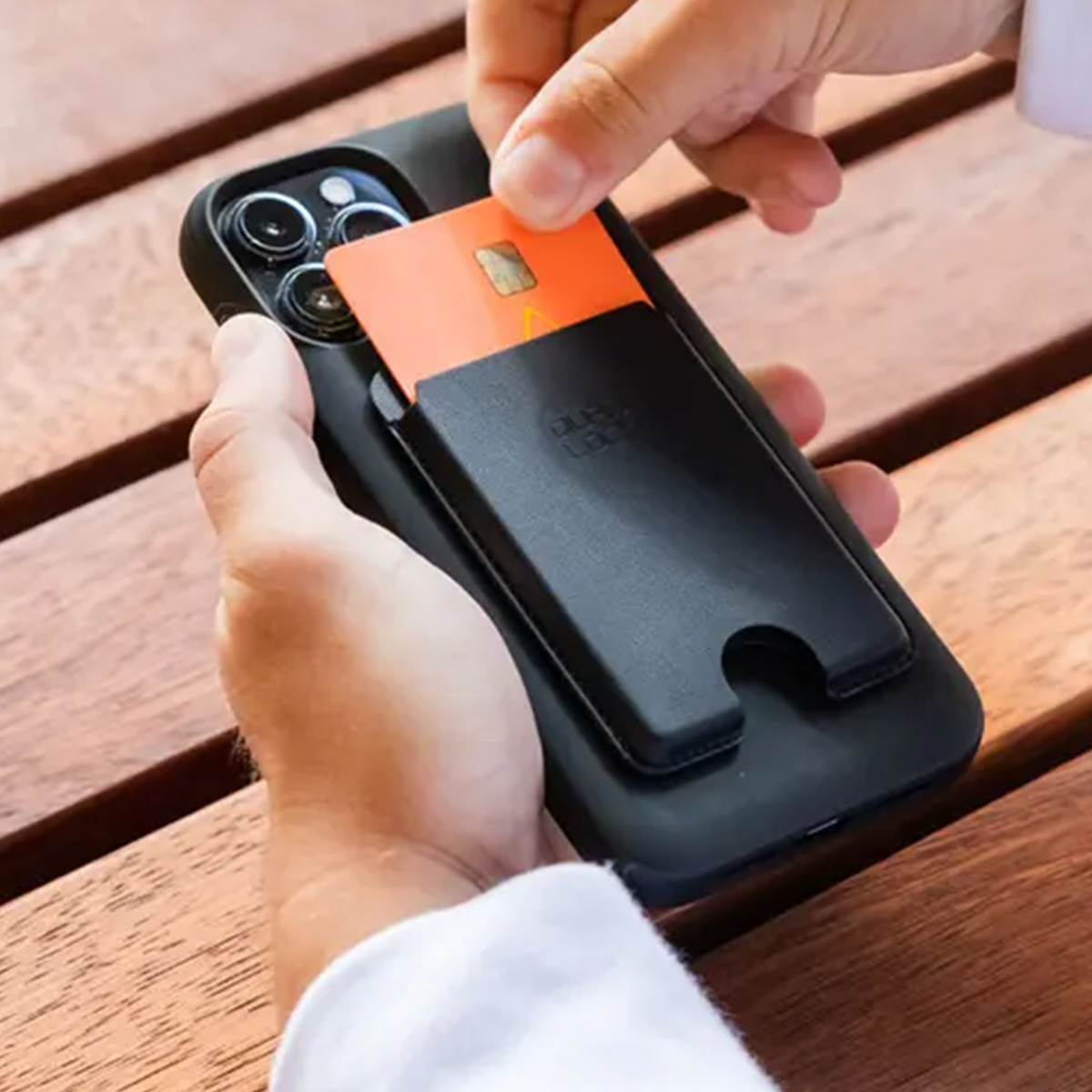 Takket være Quad Lock®-funktionen og stærke magneter kan du være helt sikker på, at dine kort holdes sikkert på bagsiden af din telefon. Selv når du fjerner din telefon fra lommen, forbliver tegnebogen sikkert låst på plads.