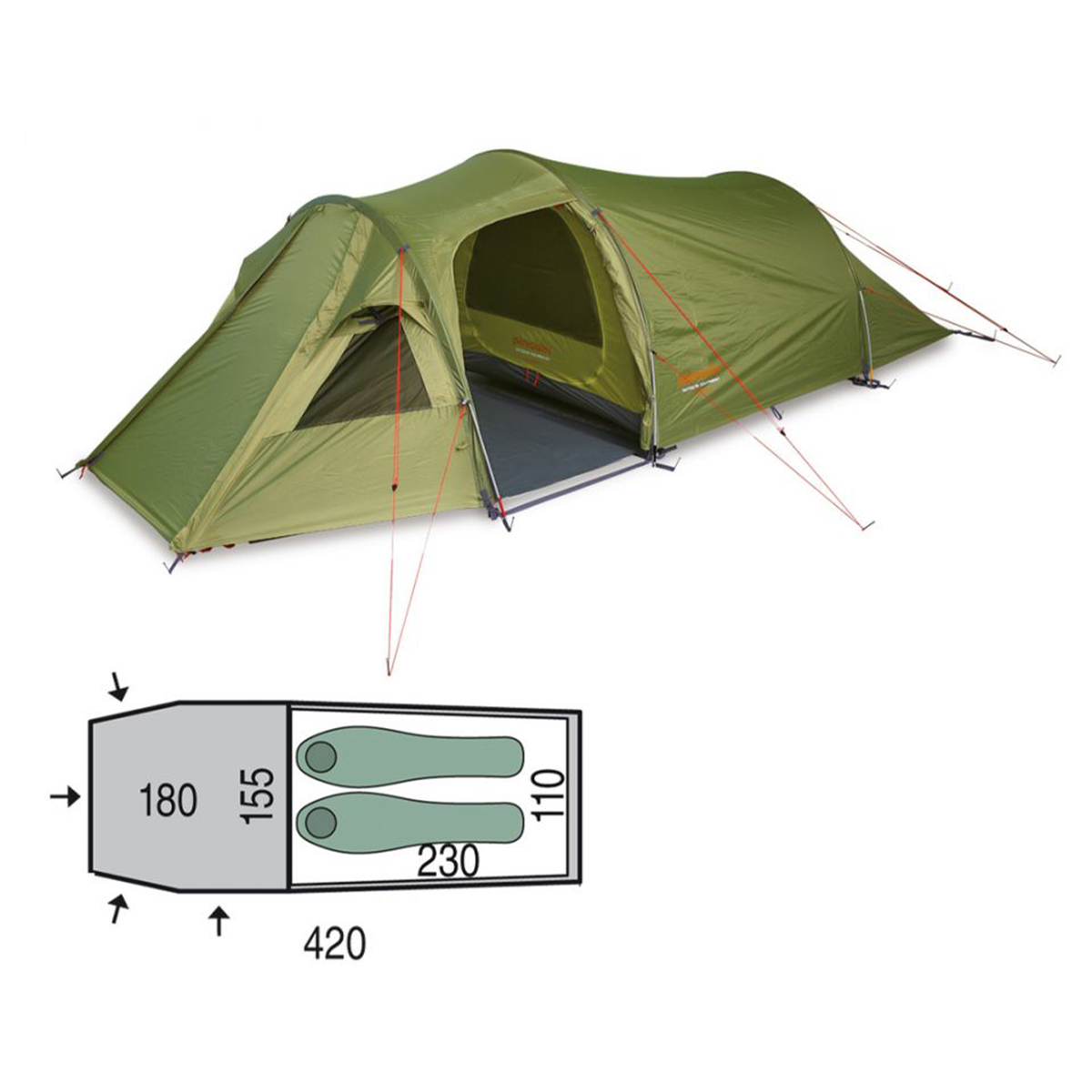 Meget rummeligt telt af tunneltypen, egnet selv til værre vejrforhold, takket være dets lave profil.
