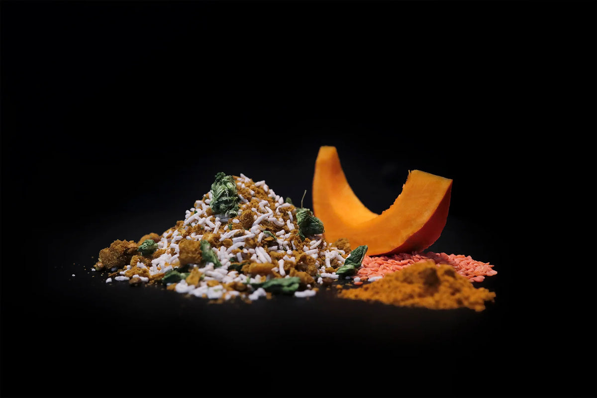 Ingredienser: For at lave 100 g tørt produkt bruges 49 g linser* (røde, grønne), 28 g ris*, 26 g butternutsquash*, løg*, rapsolie*, kokosextrakt*, 17 g spinat*, salt, æbleeddike*, ingefærjuice*, karry* (indeholder sennep), hvidløg*, gulerod*, porre*, blomkål*, persille*, broccoli*, fennikel*, savoykål*, selleri*, sukker*, gurkemeje*, chili*, krydderier*.
