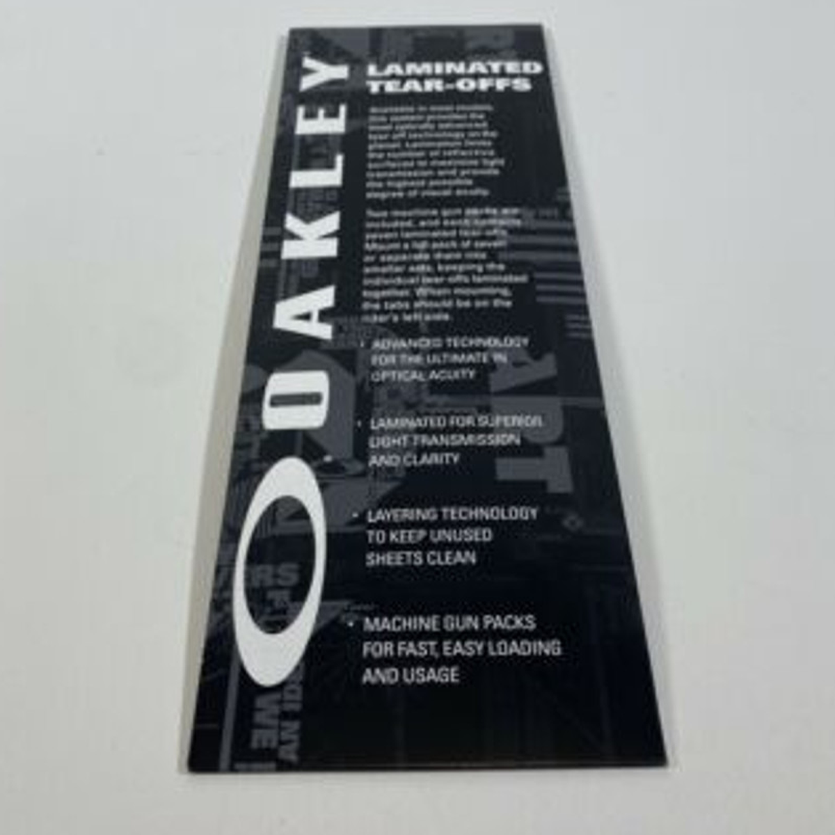 Når dækkene rammer sporet, er der intet sted at gemme sig for snavs og snavs. Hold dit syn klart efter et hvileangreb med disse Oakley laminerede beskyttelsesbriller. Du skal blot rive den øverste stribe af for at få den racer, der troede, han kunne passere dig, tilbage i dine kikkert. De er konstrueret med henblik på bekvemmeligheden ved hurtig, nem lastning og hurtig udløsning, når hygget rammer raceren. De er lavet af Mylar i optisk kvalitet for at holde dit syn klart og beskytte dine linser, så du kan holde dine øjne på målstregen. Lamineringen minimerer antallet af reflekterende overflader, samtidig med at ubrugte plader holdes rene. Hver drejning og hvert hop kræver frit udsyn for at få den bedste tid, så hold din krystalklar med disse Oakley laminerede goggle tear-offs.