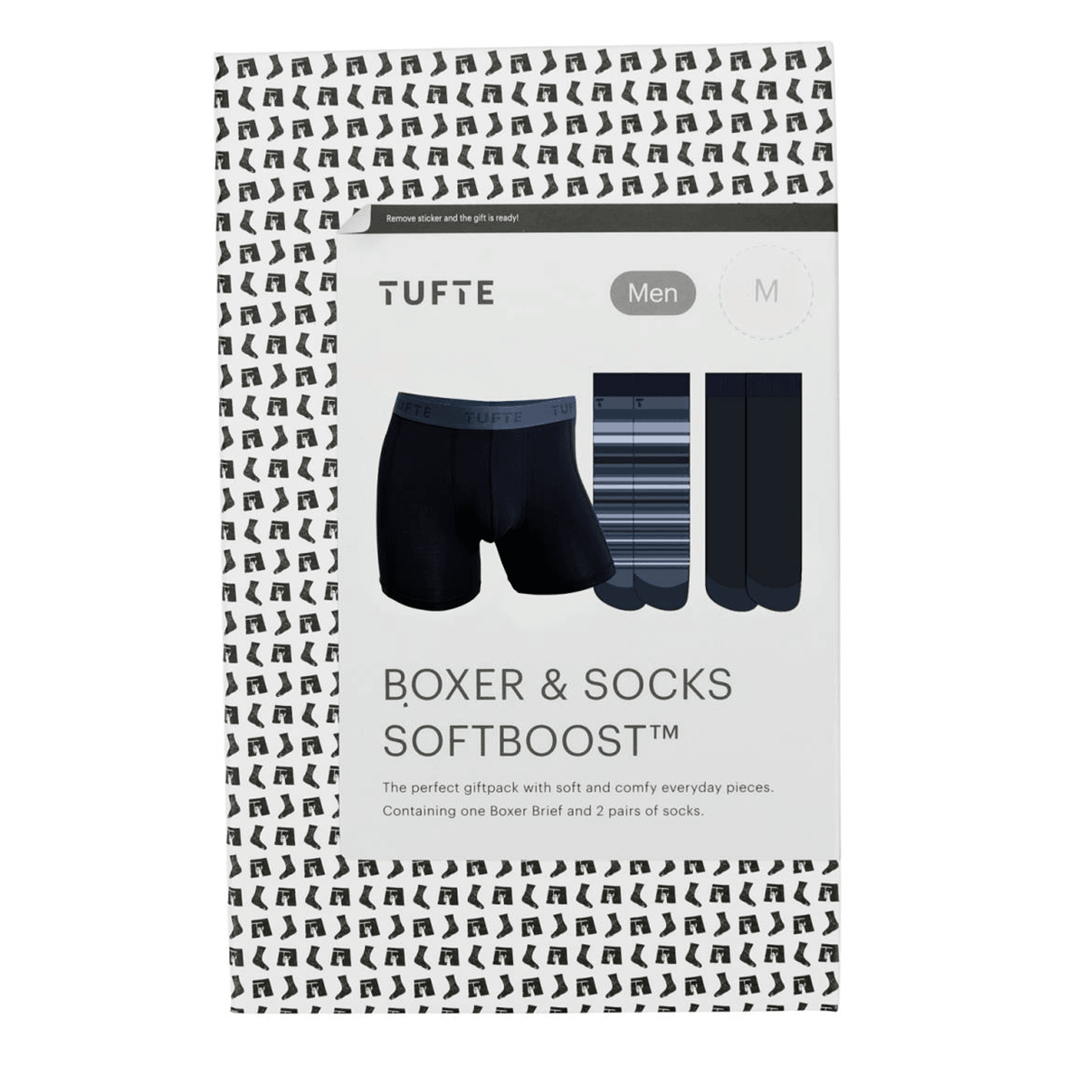 Hverdagspakke! En super blød boxer og to par strømper til mænd fra Tufte - nok til at gøre dig lidt mere komfortabel i hverdagen. Praktisk og behagelig på samme tid, og pakket i en flot gaveæske.