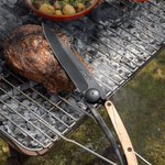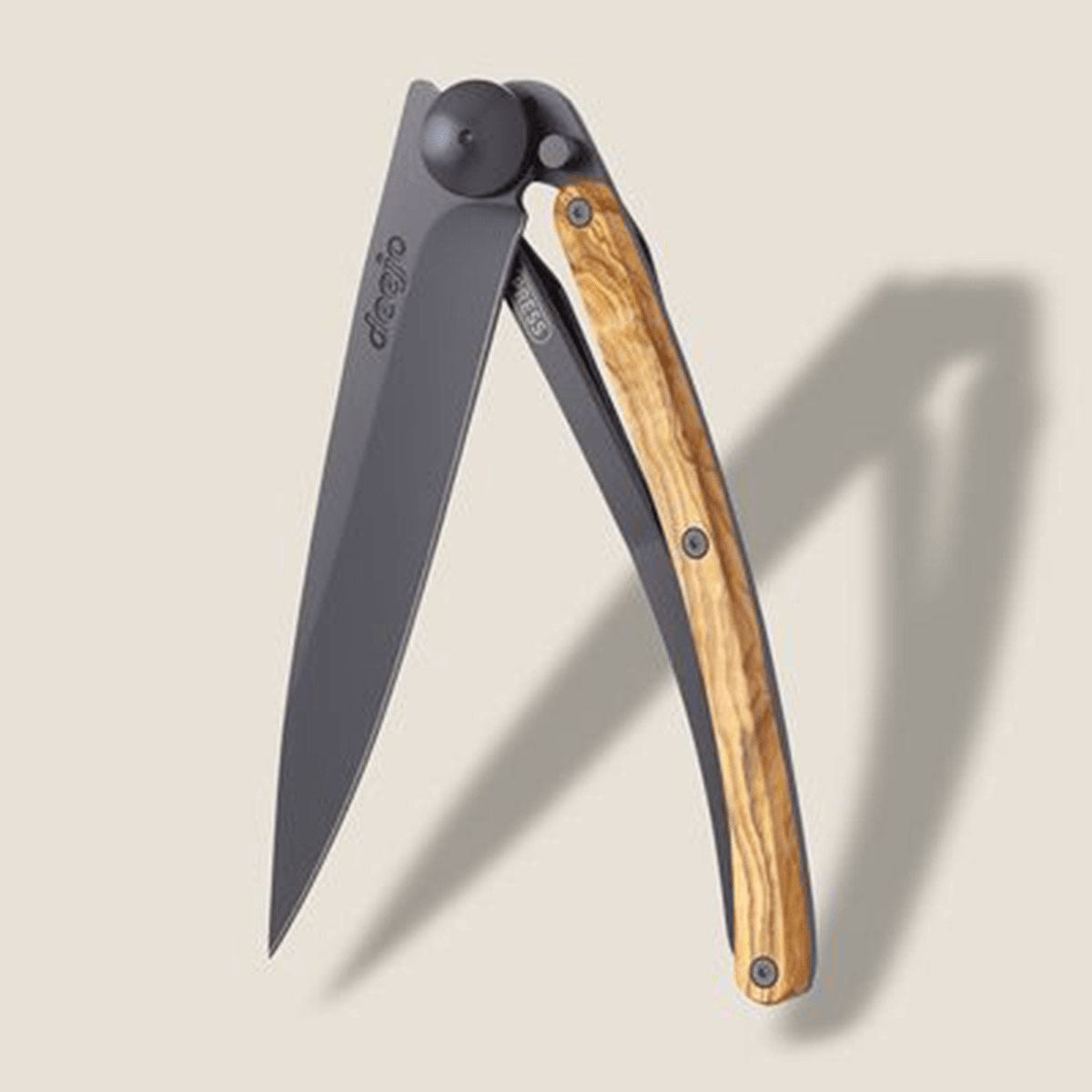 Håndtaget er dekoreret med en plade af oliventræ. Oliventræ, kendt for sin robusthed og antibakterielle egenskaber, er en stor klassiker indenfor bestik. Hvert stykke er bredt anerkendt af entusiaster for skønheden i dets naturlige korn, og hvert stykke er unikt afhængigt af træet, det er lavet af, og oplyser din Deejo med fremragende arabesker af beige uden frygt for fugt eller tid.