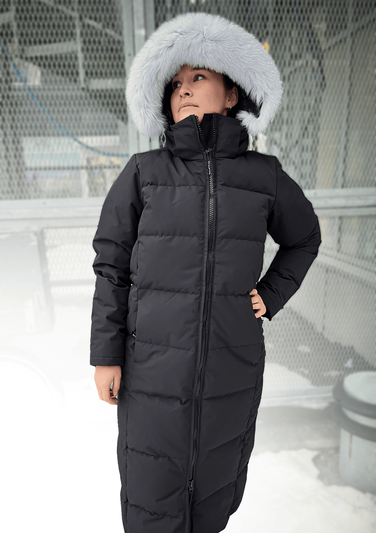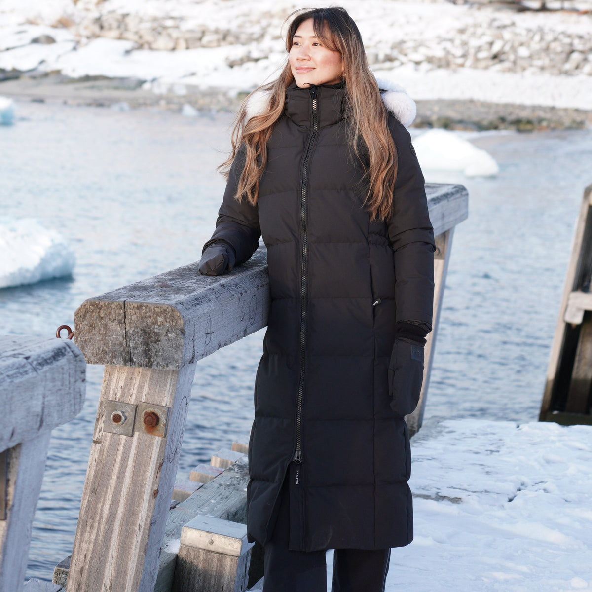 Sofia parkaen er lavet i Canada. Dens ydre stof er åndbart, vandafvisende og lavet af 43 % genbrugsfibre. Designet til at modstå ekstrem kulde (-30°C/-22°F). Isoleret med 650 Fill Power canadiske hvide andedun, hentet fra etiske gårde og af certificeret sporbar oprindelse, hvilket gør den til en forholdsvis let parka (1,4 kg/3,2 lbs.)